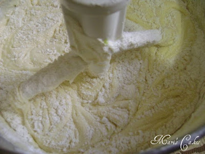 4. Start to add the mixture of flour and baking powder already sifted together (see note I, below) alternating with the mixture of milk and vanilla and ending with flour. Beat only until incorporated well (30 seconds is enough). If you decide to add the lemon zest, this is the time to add it.